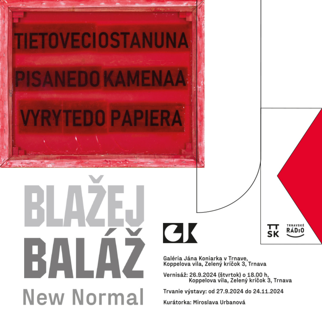 Výstava Blažeja Baláža New Normal odkazuje svojím názvom na pojem označujúci novozavedený status quo v spoločnosti či ekonomike, ktorý prichádza po krízovom období. Ide o slovné spojenie, na ktoré sme si vo verejnom diskurze zvykli predovšetkým v spojení s nedávnou pandémiou. Zvykli sme si na nový normál nových normálov – a čiže aj na nadužívanie tohto pojmu, ktoré zároveň poukazuje na relatívnosť významu slov normálny či norma – konštruktu závislého od toho, kto určuje, čo je jeho obsahom. Zároveň je New Normal v kontexte Balážovej tvorby, orientovanej na slová a grafémy, priestorom pre asociatívnu hru spájajúcu rôzne roviny čítania či dokonca časové úseky našich dejín. A v neposlednom rade je voľným spojivom s paralelnou výstavou v Synagóge – Centre pre súčasné umenie s názvom NeNormal.