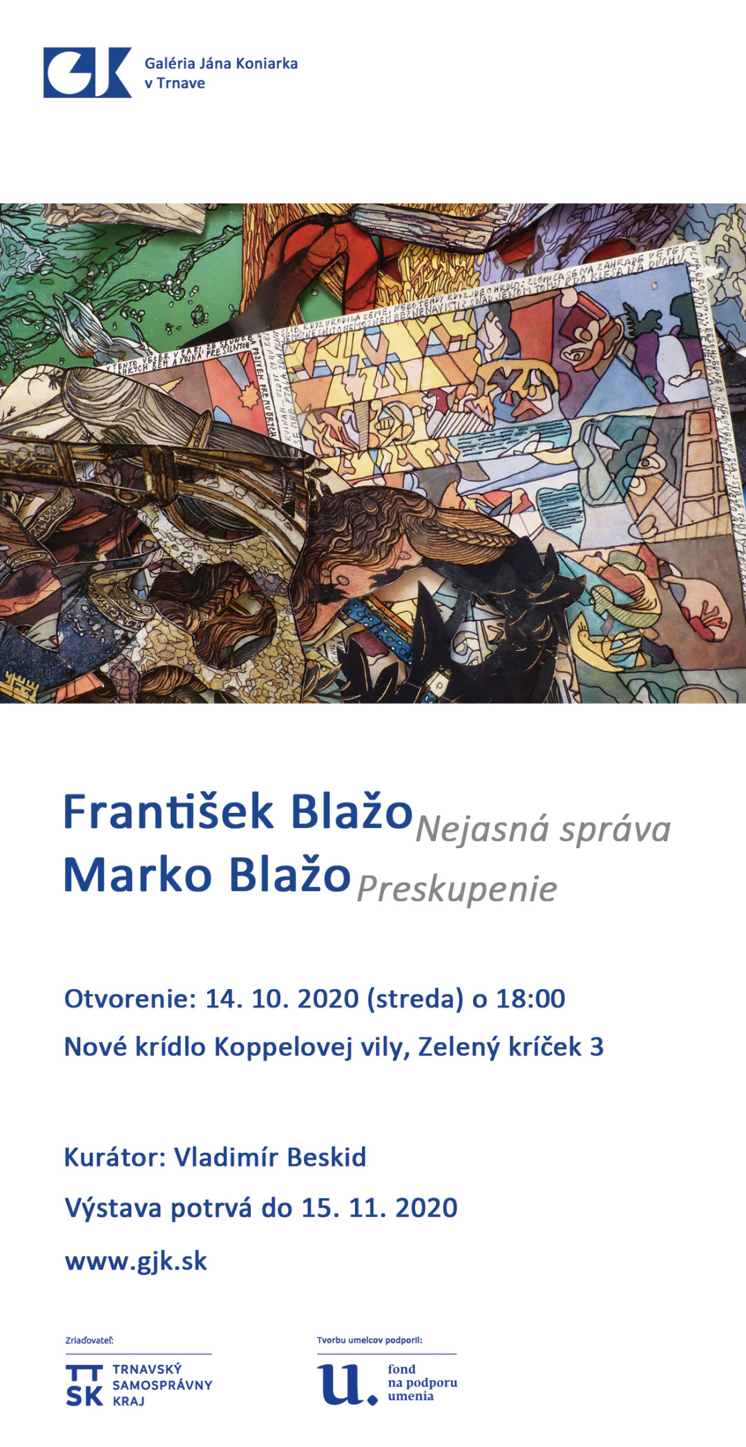Marko BLAŽO (*1972, Košice), žije a tvorí v Košiciach. Venuje sa najmä maľbe a digitálnym printom. V rokoch 1991-98 absolvoval štúdia na VŠVU v Bratislave; študijné pobyty: 1993 – École Nationale des Beaux-Arts, Dijon; 1994 – Slippery Rock University Pensylvánia. V rokoch 2000-2011 pedagogicky pôsobil na Katedre výtvarných umení a intermédií FU TU v Košiciach. Ocenenia: 2012 – Shortlisted Celeste Prize; 2009 – Winner Artslant Award, Los Angeles; Finalista Strabag Award Wien; 2008 – Finalist of Prize ARTEINGENUA, Brescia; 2007 – Finalist of Sovereign European Art Prize, Londýn; 2005 – Grand prix 16. súčasná slovenská grafika ŠG Banská Bystrica; 2001 – víťaz Ceny O. Čepana pre mladého umelca; viac na: https://www.celesteprize.com/markoblaOdozva v médiách: