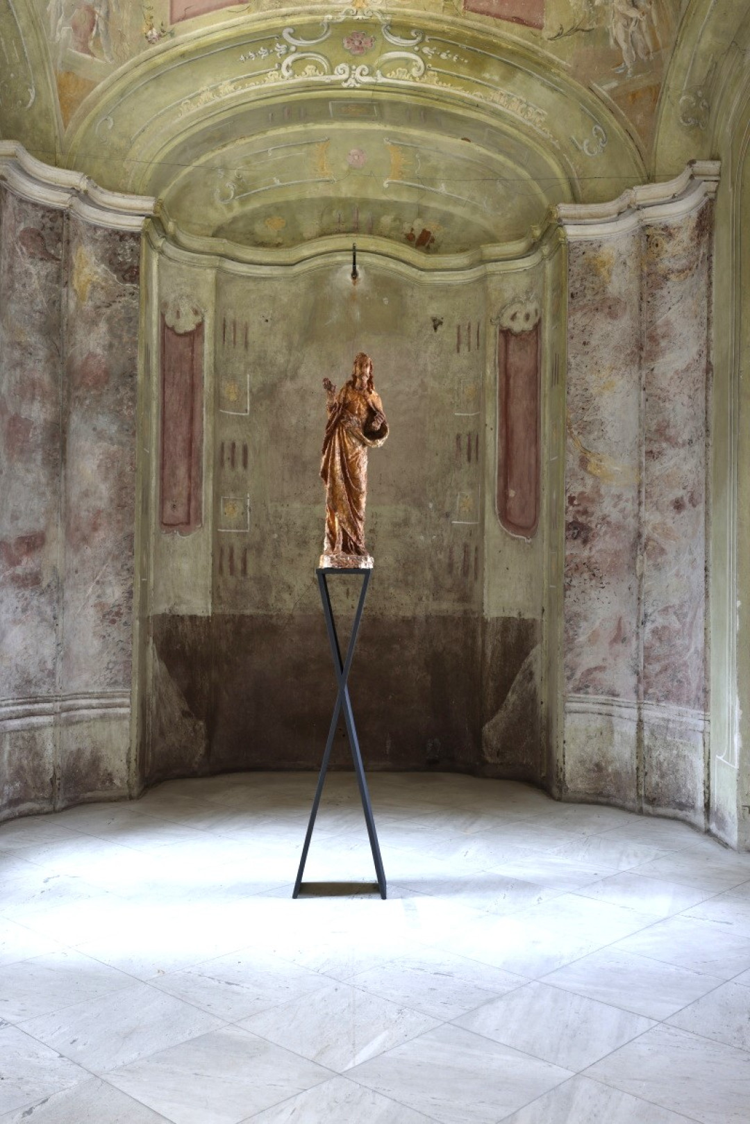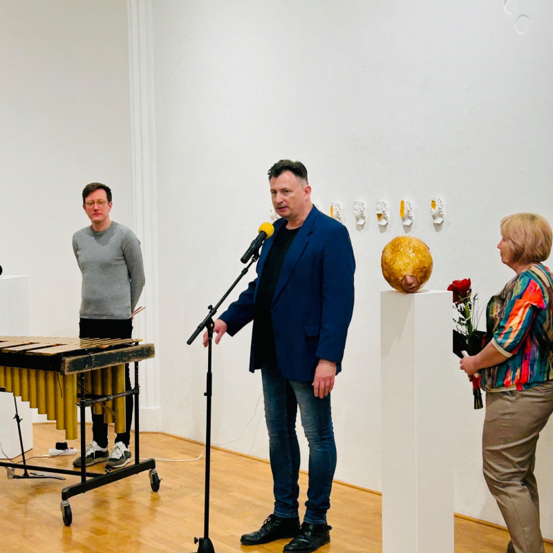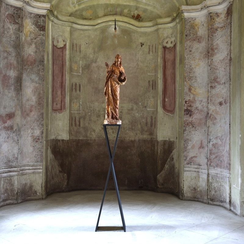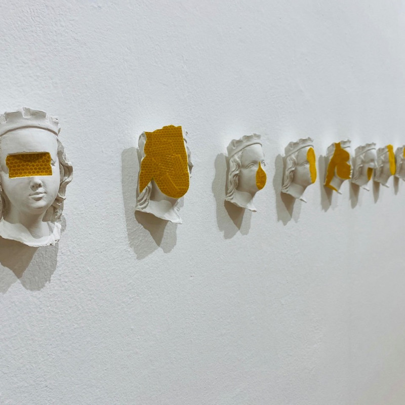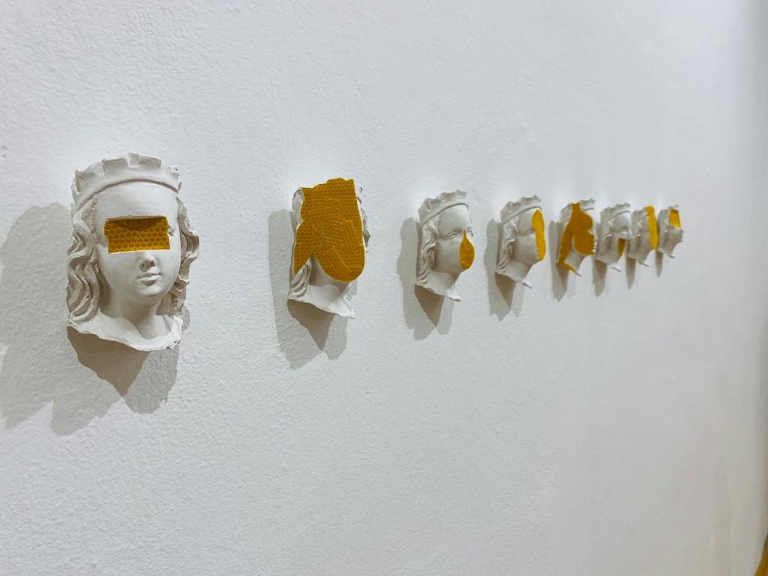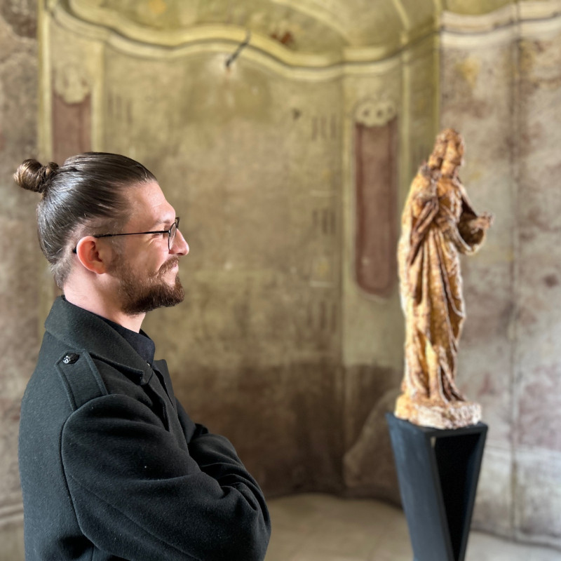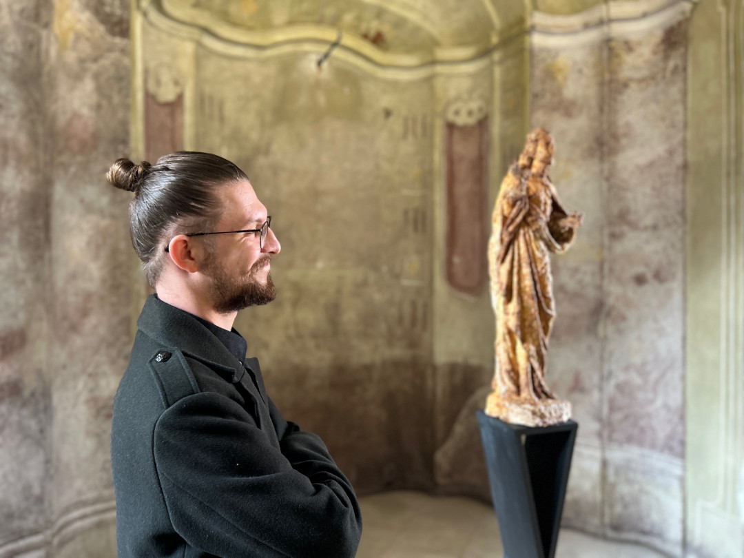 Niekoľko prác odkazuje k náboženským motívom a ich kritickému čítaniu v súčasnom svete: v kaplnke stojaca, pôvodne gotická socha Krista vytvorená z mydla odkazuje na podávanie hostie z Kristovho tela, ale aj možné „umývanie si rúk“ pri mnohých kauzách v dnešnej cirkvi (Jesus, 2024). Podoba madoninej tváre prekrytá kolekciou euromincí (Patrónka, 2024), či príznačná séria Slepota, kde sú radené podoby drobných madon so signálnou reflexnou fóliou, ktorá im zakrýva oči. Ďalej nasleduje rad prác, ktoré dokresľujú modely zaslepenosti súčasného sveta: komorný objekt Spinkaj, 2024 – dieťa položené v pripináčikoch ako podobenstvo materstva a života; nečitateľné „kamenné“ tváre, bez náznaku toku myšlienok či emócii (Poker Face), alebo hybridné tvory/tvary v podobe silikónových ľudských tvári v kombinácií s inými predmetmi či materiálmi – pauzák, zvon na čistenie odpadu, kovová konštrukcia, čo zviera malé telíčko (Kliešť; Konečne; Dýchaj – všetky 2024). Celkové vyznenie výstavy je o slepote a zaslepenosti dnešných dní, ako aj istým druhom vizuálnej diagnostiky individuálneho vnímania či skupinovej reakcie spoločnosti. Na záver sa objavujú jednoduché písmená, čo jasne definujú biele na bielom „spolu a osamelo zas a znova“ a k tomu svietiaci neónový mozog (Nebudem myslieť, nebudem myslieť, nebudem myslieť, 2023).