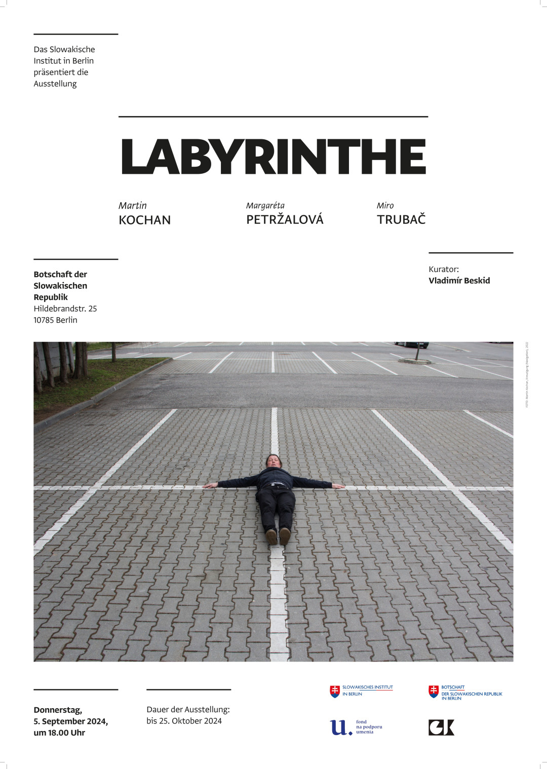 Výstavný projekt LABYRINTHE predstavuje trojicu mladých slovenských umelcov v troch rôznych médiách: fotografické performance Martina Kochana (1981), expresívne maľby Margaréty Petržalovej (1993) a figurálne sochy Mira Trubača (1986). Ide o aktuálne skúmanie a reflexiu súčasnosti, jej hybridnej, zmätenej podoby globálneho sveta v súkromnom živote jednotlivca. Výstava tak ukazuje tri rôzne prístupy k ústrednej téme labyrintov a mestských „babylonov“ s veľkou dávkou súčasnej obraznosti.