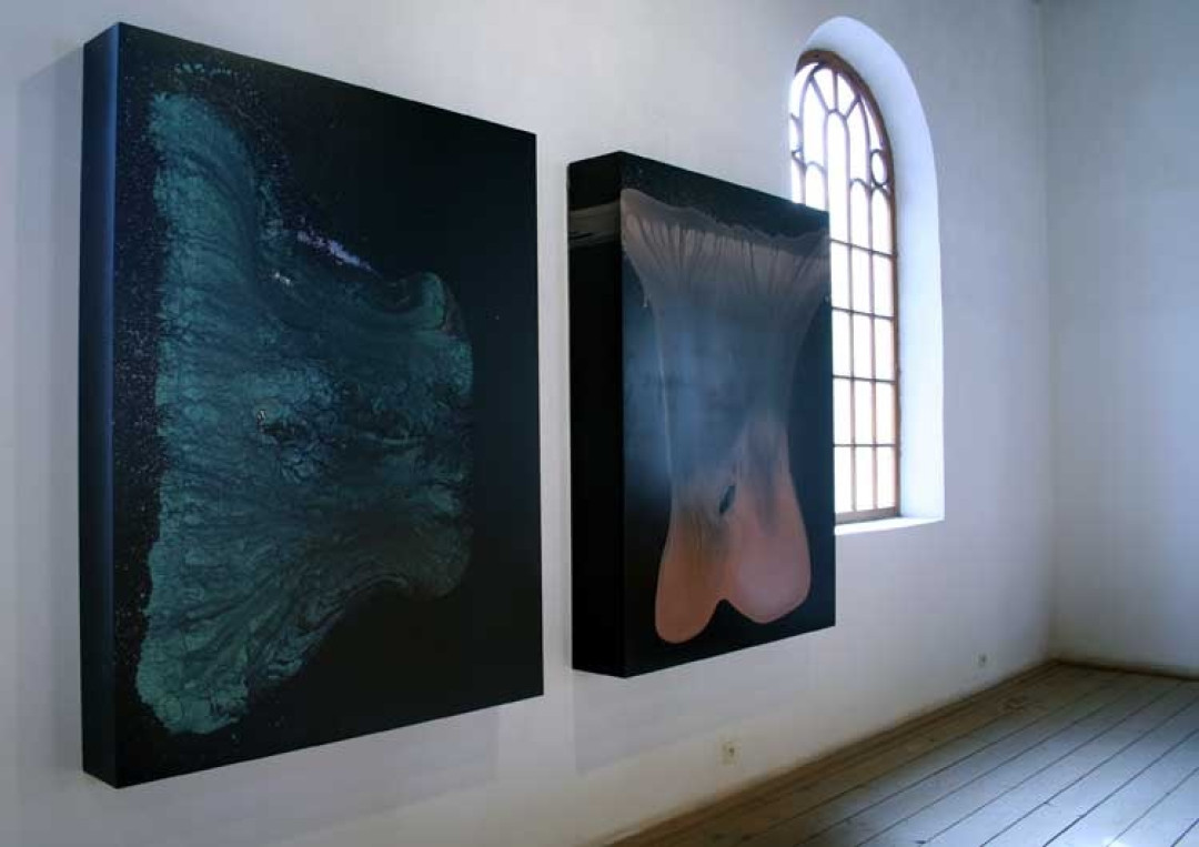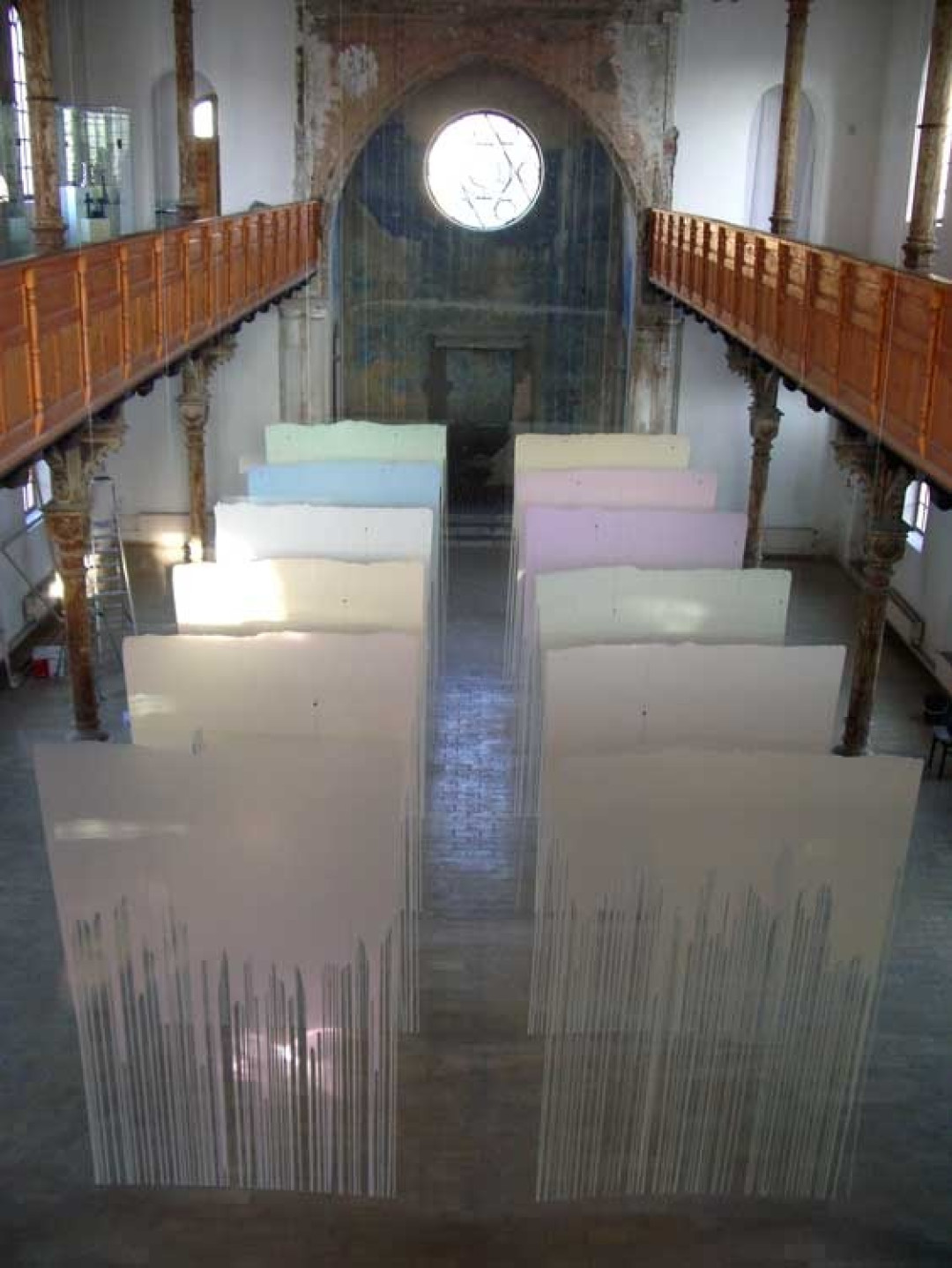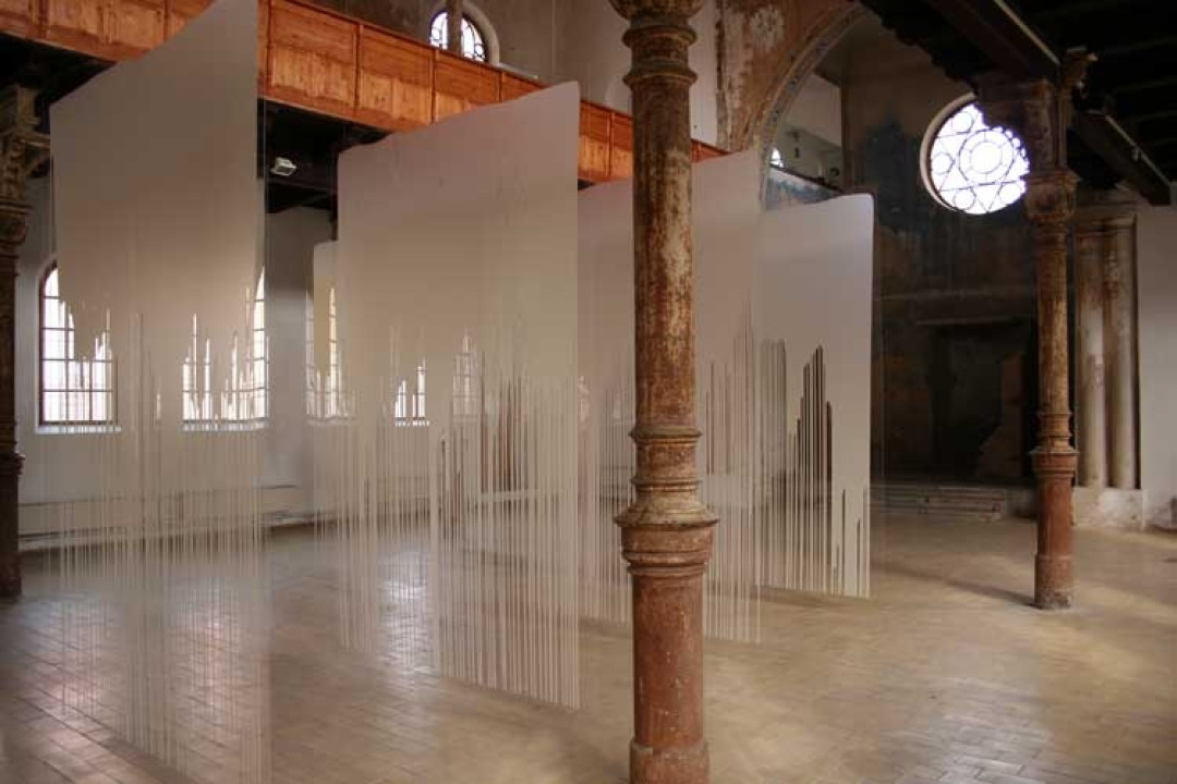 Milan Houser, Odrazy – obrazy, 2006, plexisklo, akrylátová perleť, 305 cm x 205 cm x 0,2 cm, 12 kusů, ocelová lanka