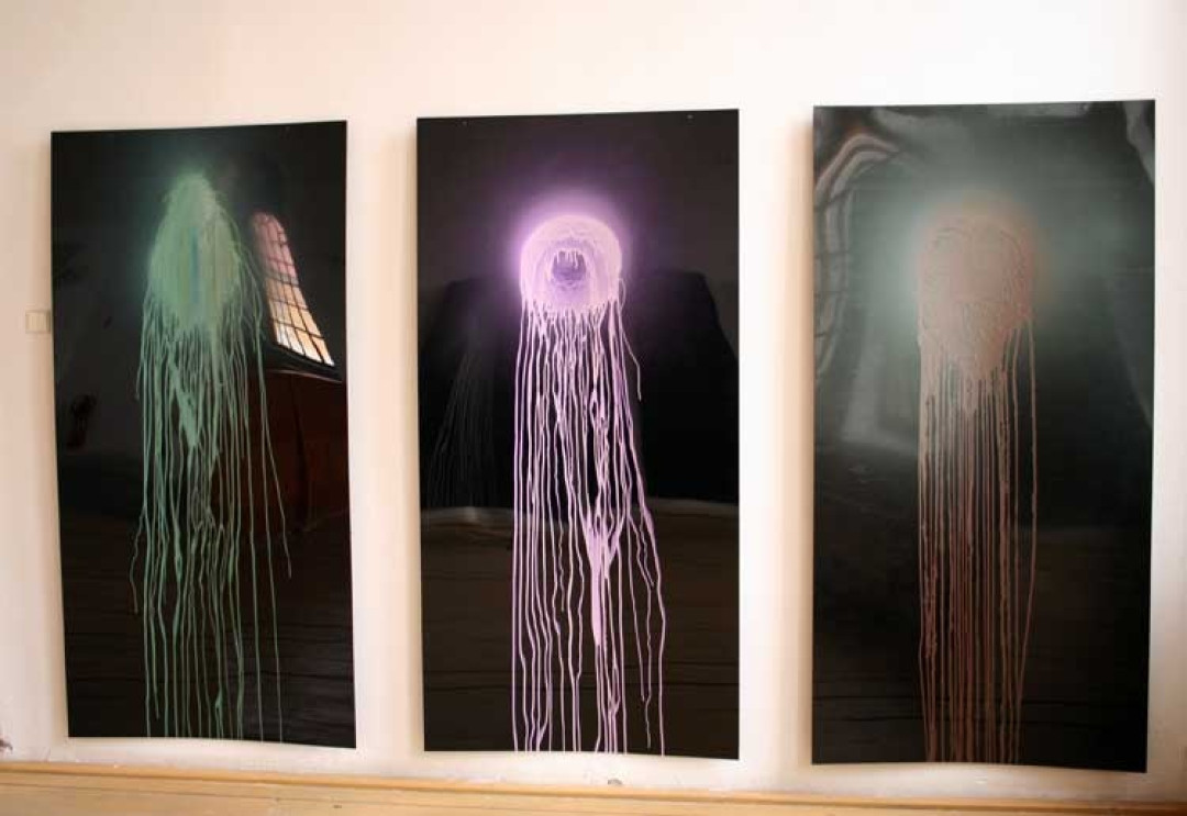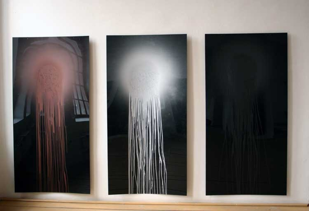 Na druhej strane vnímame uvoľnené „dýchanie“ farby - jej rozprášenosť, nestálosť, či difúzne presvitanie a znejasňovanie jednotlivých tónov, poltónov a páuz v medzi-priestore. Umiestnením inštalácie v bývalej synagóge, v objekte so silnou historickou pamäťou, dostáva inštalácia ešte ďalšie významové roviny (obrazy-odrazy aj odkazy). V tvorbe Milana Housera sa tak stretávajú dva momenty – jednak analytické myslenie s výskumom a jednak vytvorenie otvoreného poľa pre osobný zážitok, neuchopiteľnú hru reflexov medzi levitujúcimi platňami. Na toto jeho vizuálne „rozhranie“ poukazuje aj séria prác, prezentovaných na poschodí, ktorá je založená na minimalistickom striekaní 1litra akrylátu na jedno miesto určitý čas. Výsledok je zaznamenaný aj v názve práce: číslo farby, množstvo, doba striekania (napr. 190P 1l /26 min.; 334RC 1l/18 min.; 194P 1l/1ľ min. a pod).